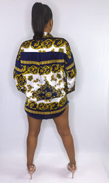 Long sleeve oversize Versace print button down blouse made with satin fabric.